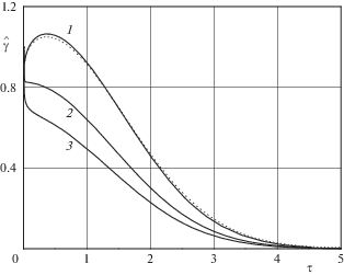 На рис. 3–4 представлено поведение зависимостей $\hat {T}\left( \tau \right) = \sqrt {\hat {F}\left( \tau \right)} $ и $\hat {\gamma }\left( \tau \right)$, соответствующих случаю ${{M}_{1}} = \Pr = 1$, ${1 \mathord{\left/ {\vphantom {1 {\ln \varepsilon }}} \right. \kern-0em} {\ln \varepsilon }} = - 0.189$ и трем разным значениям ${{F}_{*}}$: кривые 1 соответствуют значениям параметров ${{F}_{*}} = 1$, ${{\alpha }_{1}} > 0$; 2 – ${{F}_{*}} = 0.407$, ${{\alpha }_{1}} = 0$; 3 – ${{F}_{*}} = 0.2$, ${{\alpha }_{1}} < 0$; пунктирами изображено численное решение уравнений Навье–Стокса при ${{F}_{*}} = 1$ (см. разд. 8). В случае ${{\alpha }_{1}} > 0$ температура имеет максимум в области ${{G}_{1}}$; при ${{\alpha }_{1}} \leqslant 0$ – монотонно возрастает при удалении от поверхности цилиндра. Переход энергии вращательного движения в тепловую вызывает рост температуры газа в области ${{G}_{1}}$, в области ${{G}_{2}}$ – влияние на изменение температуры газа в основном оказывает диффузия тепла. Рост температуры газа вызывает увеличение коэффициента динамической вязкости $\left( {\mu \sim T} \right)$ и появление градиента вязкости $\left( {{{\partial \mu } \mathord{\left/ {\vphantom {{\partial \mu } {\partial r}}} \right. \kern-0em} {\partial r}}\sim {{\partial T} \mathord{\left/ {\vphantom {{\partial T} {\partial r}}} \right. \kern-0em} {\partial r}}} \right)$, что в случае ${{\alpha }_{1}} > 0$ приводит к немонотонному изменению циркуляции вращательного движения вдоль координаты $r$. По мере удаления от поверхности цилиндра завихренность