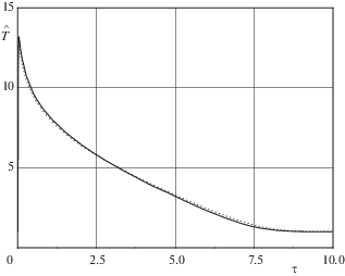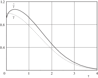 На рис. 7–8 представлено поведение зависимостей $\hat {T}\left( \tau \right) = \sqrt {\hat {F}\left( \tau \right)} $ и $\hat {\gamma }\left( \tau \right)$ (разд. 5), соответствующих случаю ${{M}_{1}} = 7$, ${{F}_{*}} = \Pr = 1$ и ${1 \mathord{\left/ {\vphantom {1 {\ln \varepsilon }}} \right. \kern-0em} {\ln \varepsilon }} = - 0.217$ (сплошные кривые), и численного решения уравнений Навье–Стокса при тех же значениях параметров (пунктир).