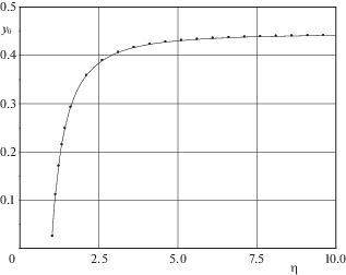 $y\left( \eta \right) = {{y}_{0}}\left( \eta \right) + \frac{1}{{\ln \varepsilon }}{{y}_{1}}\left( \eta \right) + O\left( {\frac{1}{{{{{\ln }}^{2}}\varepsilon }}} \right)$Из решений (4.8), (4.11), (4.12) следует, что ${{y}_{0}}\left( \eta \right)$ не содержит логарифмического члена при $\eta \to \infty $. Уравнение и граничные условия для функции ${{y}_{0}}\left( \eta \right)$ имеют вид