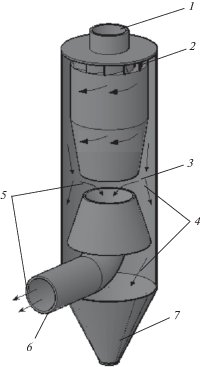 1. Физическая и математическая постановки задачи. Принципиальная схема центробежного сепаратора показана на рис. 1. Центробежный воздушный сепаратор работает следующим образом. Исходный материал подается через патрубок 1 в верхнюю часть сепаратора. Управляемыми лопатами 2 потоку воздуха придается вращательное движение. Под действием центробежной силы инерции частицы движутся к внутренней цилиндрической стенке корпуса сепаратора и попадают в зону классификации 3, расположенную между усеченными конусами и стенкой корпуса сепаратора. Крупные частицы – линии 4, вследствие своей большей массы под действием центробежной силы накапливаются около внутренней стенки корпуса сепаратора и по инерции попадают в бункер сепаратора 7. А мелкие частицы – линии 5, увлекаются воздухом и выносятся из сепаратора через выходной патрубок 6, который соединен с всасывающим вентилятором. Таким образом, исходный материал разделяется на две фракции.