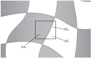 2. Новая двухжидкостная модель турбулентности. Рассмотрим течение двух жидкостей составляющие гетерогенную смесь, где эти жидкости состоят из отдельных объемов. На рис. 2 показано течение такой смеси в плоскости перпендикулярной к направлению i. Здесь темным цветом обозначена I жидкость и светлым цветом II жидкость. Обозначим через ${{V}_{1}}$, ${{V}_{2}}$ их скорости. Будем считать их плотности одинаковыми и равными $\rho $. Пусть $\Delta {{S}_{i}}$ неподвижная элементарная площадь, а $\Delta {{S}_{{1i}}}$ – площадь занимаемая жидкостью I и $\Delta {{S}_{{2i}}}$ – жидкостью II. Очевидно, что