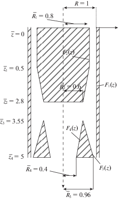 Для численной реализации уравнений расчетная область приведена к прямоугольным областям. Для этого произведена замена переменных (z, r) на (ξ, η), где ξ = z, а вторая переменная определялась из соотношений