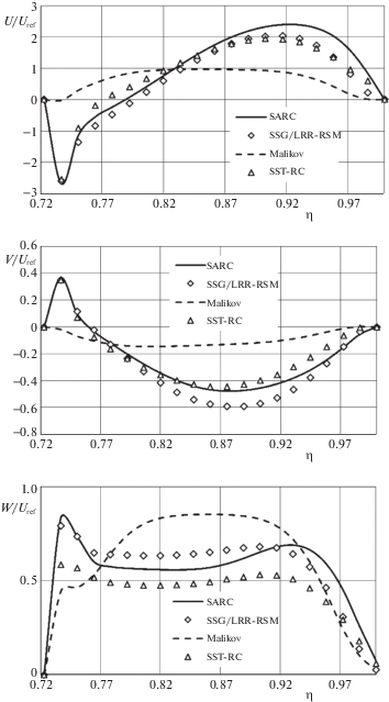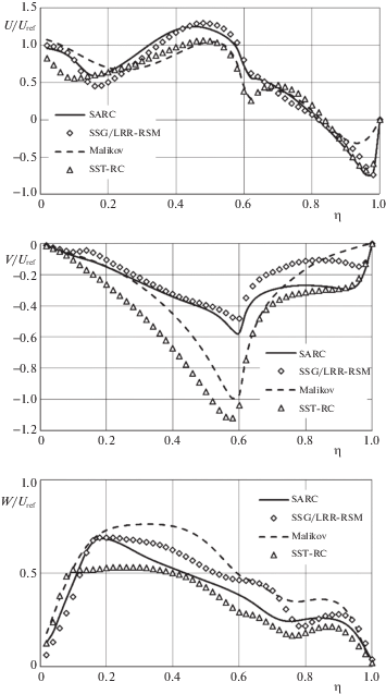 4. Обсуждение результатов. На рис. 4 иллюстрируются профили скоростей воздуха в сечении $z = 2$. Здесь $U{\text{/}}{{U}_{{\operatorname{ref} }}}$, $V{\text{/}}{{U}_{{\operatorname{ref} }}}$, $W{\text{/}}{{U}_{{\operatorname{ref} }}}$ безразмерные скорости. Данное сечение соответствует течению в расширяющемся коаксиальном канале.