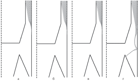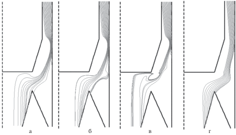 Линии тока скорости в сепараторе, рассчитанные различными моделями. а) SARC, б) SST-RC, в) SSG/LRR-RSM, г) двухжидкостная модель.