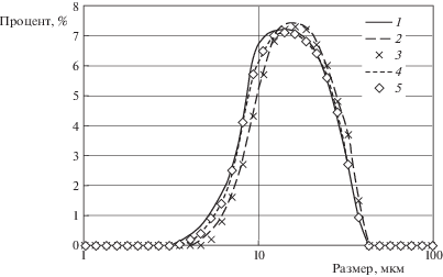 Дисперсный анализ состава цинкового порошка из бункера сепаратора. 1 – SSG/LRR-RSM, 2 – SARC, 3 – SST-RC, 4 – новая двухжидкостная модель, 5 – данные анализатора.