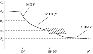 При ${{\sigma }_{{VH}}} \leqslant {{\tilde {\sigma }}_{u}}$ усталостного разрушения не происходит, при ${{\sigma }_{{LH}}} \geqslant {{\sigma }_{B}}$ оно наступает мгновенно.