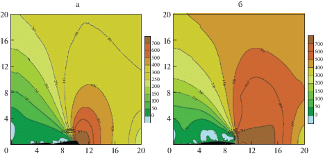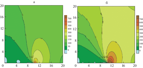 а – Режим СВМУ: $P = 160$ МПа, ${{N}_{k}} = 6.799 \times {{10}^{7}}$, ${{N}_{i}} = 1.007 \times {{10}^{6}}$, ${{N}_{f}} = 6.806 \times {{10}^{7}}$; б – Режим МНЦУ: $P = 210$ МПа, ${{N}_{k}} = 3.765 \times {{10}^{6}}$, ${{N}_{i}} = 7.229 \times {{10}^{4}}$, ${{N}_{f}} = 3.807 \times {{10}^{6}}$.