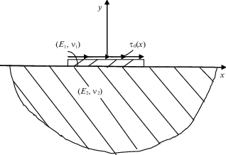 1. Постановка задачи и ее редукция к нелинейному интегральному уравнению. Пусть линейно-упругая бесконечная пластинка (занимающая нижнюю полуплоскость комплексной плоскости) с модулем упругости ${{E}_{2}}$ и коэффициентом Пуассона ${{\nu }_{2}}$ на конечном отрезке $[ - 1,1]$ оси $Ox$ усилена нелинейно-упругим стрингером в виде накладки конечной длины и достаточно малой толщины ${{h}_{1}}$, модулем упругости ${{E}_{1}}$ и коэффициентом Пуассона ${{\nu }_{1}}$, загруженной тангенциальной силой интенсивности ${{\tau }_{0}}(x)$. Контакт между ними осуществляется через тонкий слой клея с модулем упругости ${{E}_{0}}$, коэффициентом Пуассона ${{\nu }_{0}}$ и шириной ${{h}_{0}}$. В условиях плоского напряженного состояния требуется определить касательное контактное напряжение $\tau (x)$, действующего на отрезке соединения стрингера с пластинкой (рис. 1).