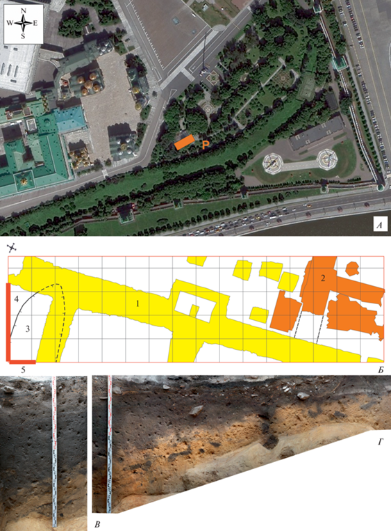 Раскоп в Большом Кремлевском сквере. А – космоснимок юго-восточной части Кремля (Р – раскоп); Б – схема раскопа: 1 – фундаменты Новых Приказов; 2 – Старые Приказы; 3 – ложбина, заполненная отложениями раннего железного века; 4 – юго-западный профиль; 5 – юго-восточный профиль (3, 4 и 5 относятся к сектору 1); В – юго-восточный профиль (нижняя часть); Г – юго-западный профиль (нижняя часть).
