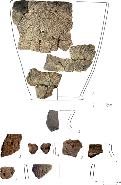 К преддьяковскому этапу отнесено шесть небольших обломков с характерными внешними особенностями (рис. 2, 3–8). Это фрагмент “текстильного” сосуда, с внутренней стороны которого в области плечика нанесены мелкие ямки (рис. 2, 4), которые снаружи образуют слабовыпуклые “жемчужины”. Так называемый жемчужный орнамент на “текстильной” керамике хорошо известен на памятниках эпохи финальной бронзы Плещеева озера (Веськово 1), Среднего Поочья (Тюков Городок), датируемых первой половиной I тыс. до н.э. (Фоломеев, 1975. С. 168; Вишневский, 1990. С. 13), и на ряде памятников финальной бронзы и раннего железного века Костромской низины – Ватажка, городище в Костроме и др. (Новиков, 2018).