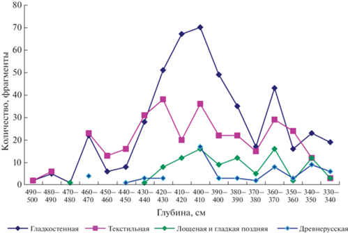 По материалам сектора 1, где сохранился слой раннего железного века (933 фрагмента), было составлено распределение групп керамики по глубинам (рис. 3). В силу сильной нарушенности культурного слоя оно не несет значимой культурно-хронологической информации, но все же позволяет сделать ряд важных наблюдений. Во-первых, распределение “текстильной” керамики по глубинам не показывает закономерности, обычной для москворецких городищ дьякова типа с ненарушенным слоем, ни на уровне относительно горизонтального залегания слоя (выше –370–380 см), ни в заполнении ложбины (глубины от –370–380 до –440–500 см). Доля “текстильной” керамики в верхних слоях не уменьшается, она встречается совместно и при этом массово с типичной для позднего дьяковского времени керамикой. Такая картина однозначно указывает на то, что ранний дьяковский слой в значительной степени был перемешан, скорее всего, в процессе засыпки ложбины в XII–XIII вв. Во-вторых, именно из заполнения ложбины происходит максимальное количество керамики (гладкостенной, “текстильной”, лощеной и поздней гладкой). В‑третьих, по характеру распределения можно предполагать, что в наименьшей степени была перемешана нижняя часть заполнения ложбины. На отметках от –450–460 до –490–500 см в ложбине залегал однородный темно-серый слой, в котором “текстильная” керамика незначительно, но все же преобладала над гладкостенной. Возможно, отложение тут раннедьяковского слоя связано с его естественным оползанием вниз по склону. Затем он был перекрыт перемещенным грунтом с площадки городища, содержавшим как ранние, так и поздние дьяковские материалы.