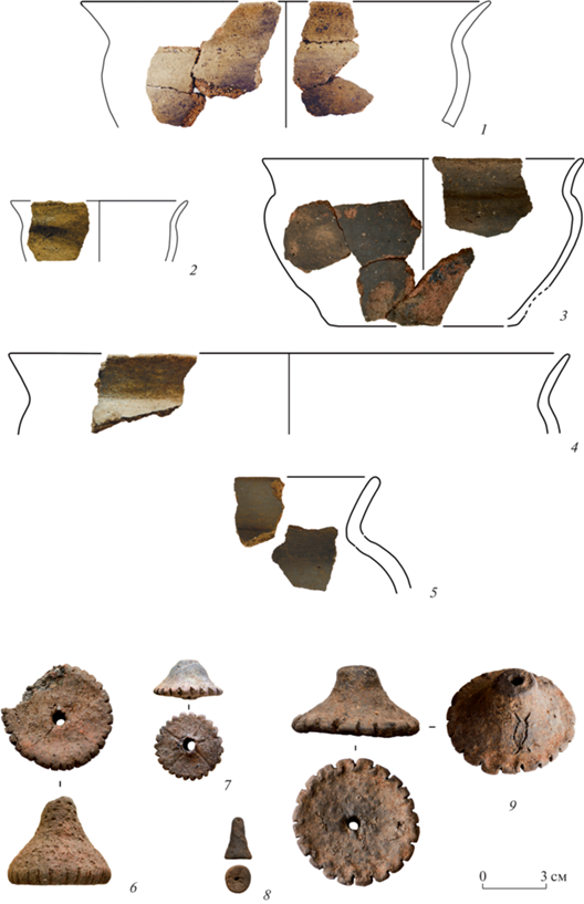 Fig. 6. Burnished pottery of the late Dyakovo culture from the excavation site in the Great Kremlin Garden (1–5). Clay objects (6–9)