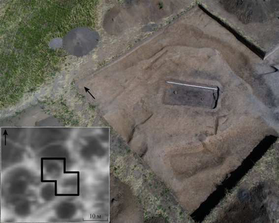 Могильник Гнездилово 12. Вид на площадку кургана 1 с юго-запада и фрагмент электротомографического плана.