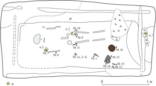 Могильник Гнездилово 12, погребение 19. План. а — проба древесины.