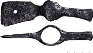 В типологическом плане новые находки разнообразны. Обычные для славянского мира топоры с вырезным обухом (типа IV) преобладают (4 экз.), но многочисленны также и топорики с молоточком на обухе типа I (3 экз.), в целом широко распространенные в Восточной Европе, но особенно характерные для комплекса вооружения поволжских финнов и жителей Волжской Болгарии. Узколезвийные топоры с вырезным обухом (тип III) иногда рассматриваются как тип, первоначально имевший южнорусское происхождение (Плавинский, 2014. С. 66–68).