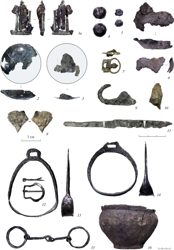 Весы сильно повреждены коррозией: в неполном виде сохранились две чашечки диаметром около 4 см и коромысло (рис. 4, 1а, 2, 3). Находки весов для малых взвешиваний в древнерусских погребениях и проблемы социальной интерпретации подобных комплексов подробно рассмотрены М.О. Жуковским (2019, 2021). В составленном им каталоге учтено чуть более 90 погребений с целыми весами и их деталями, наиболее многочисленная серия (18 погребений) представлена в Гнёздове. В раскопках А.С. Уварова находки весов зафиксированы в 16 погребениях в 7 могильниках, 3 из которых – Шекшово (4 погр.), Васильково (1 погр.), Вески (1 погр.) – находятся на территории Владимирско-Юрьевского Ополья (Жуковский, 2019. С. 124–147). По наблюдения М.О. Жуковского, большинство погребений с весами – мужские (хотя документировано также и присутствие весов в погребениях женщин и детей), многие из них представляют собой камерные могилы, значительная часть таких погребений содержит также оружие и конское снаряжение. Совместная встречаемость весов, оружия и предметов конского снаряжения характерна, в частности, для ярославских могильников. Из двух известных в Тимеревском некрополе погребений со стременами одно (камерная могила 100) содержало также весы в футляре (Фехнер, Янина, 1978).