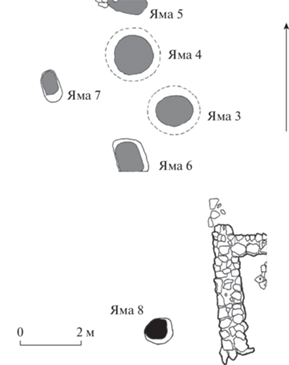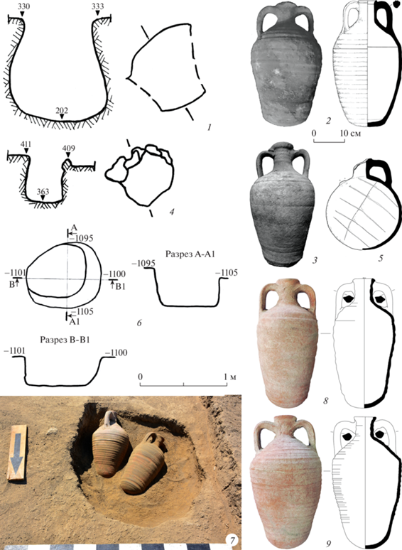 Среди ям, зафиксированных на участке античного некрополя, типологически близок вышеописанным объект № 8 (рис. 3, 6). Ямное пятно выявлено в 2021 г. после разбора небольшого каменного завала вблизи стены каменного дома. Форма ямы в плане приближается к овальной. Размер горловины по уровню материка составляет 0.8 × 0.7, дна – 0.7 × 0.6, глубина – 0.3 м. Дно ровное. Яма сужается книзу, южная стенка ямы более пологая, чем северная. Грунт заполнения – желто-коричневый суглинок с незначительной примесью золы. На дне ямы находились две абсолютно целые амфоры “причерноморского” типа, лежавшие на боку (рис. 3, 7–9). Их горловины так же находились на уровне горловины ямы. Сохранность сосудов свидетельствует о том, что к моменту засыпки ямы они были полностью заполнены жидкостью и запечатаны. Никаких других археологических находок зафиксировано не было. Помимо этого, во всех трех описанных ямах никаких остатков зерновых культур, следов обмазки стенок ям известковым раствором, скопления костей животных зафиксировано не было.
