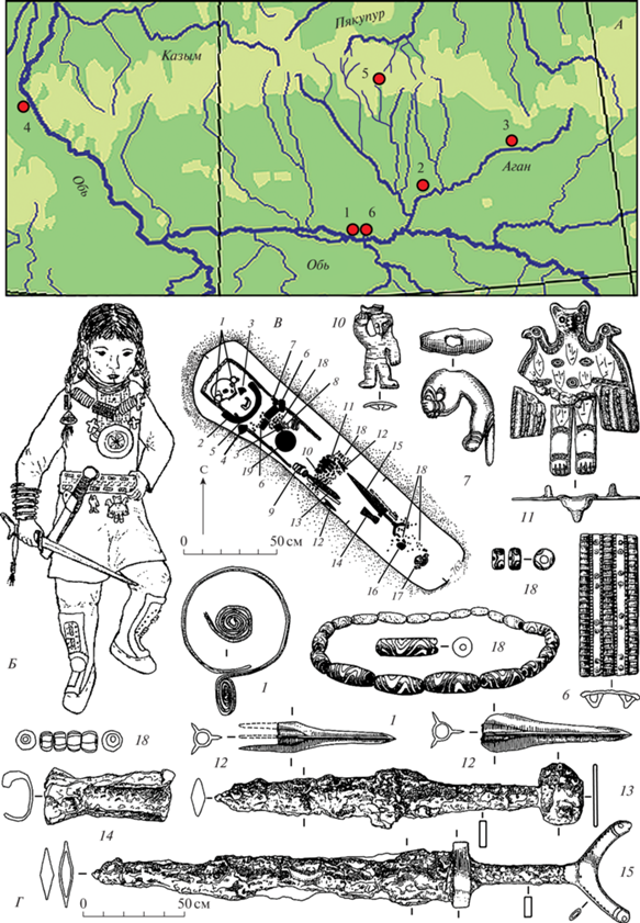 Карта памятников с погребальными объектами кулайской элиты Сургутского и Нижнего Приобья; погребение 1 Барсовского III могильника: А – карта памятников: 1 – Барсовский III могильник, 2 – могильник Нивагальское 34, 3 – могильник Агрнъеган 1, 4 – Шеркалинский могильник, 5 – Холмогорский погребальный комплекс, 6 – клад на городище Барсов Городок I/20; Б – костюм мальчика-воина из погребения 1 Барсовского III могильника (реконструкция А.П. Зыкова) В, Г – план погребения 1 (север – магнитный) и находки из него: 1 – серебряные кольца (2 шт.), 2 – серебряная накладка, 3 – фрагменты бронзовых зеркал, 4 – подвески из распиленного зеркала с рифленым концентрическим орнаментом (2 шт.), 5 – бронзовая рифленая пронизка, 6 – бронзовые накладки гофрированные (2 шт.) и с гофрированно-жемчужным декором (1 шт.), 7 – бронзовая полая зооморфная подвеска, 8 – крестовидные изделия из медной проволоки, 9 – бронзовый витой браслет, 10 – бронзовая антропоморфная подвеска, 11 – бронзовая орнито-зоо-антропоморфная накладка-подвеска, 12 – медные или бронзовые наконечники стрел (2 шт.); 13 – железный кинжал, 14 – железный топор-кельт, 15 – железный кинжал с бронзовыми перекрестьем и навершием, 16 – серебряная фольга на бересте, 17 – глиняный горшок, 18 – стеклянные и сердоликовые бусы, бисер (367 шт.), 19 – бронзовое зеркало с лепестковой розеткой и циркульным декором; (см.: Борзунов, Зыков, 2003. Рис. 1–6; Чемякин, 2008. Рис. 83 ).