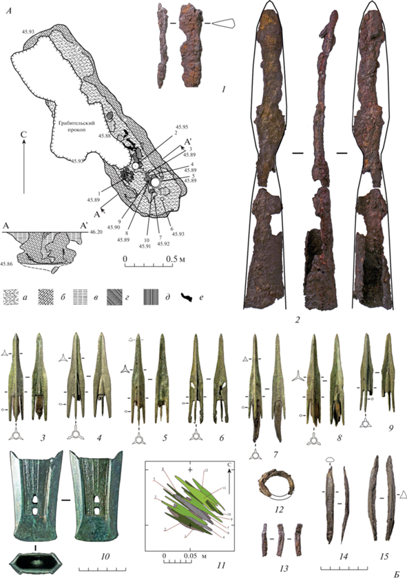 Могильник Нивагальское 34. Погребение 1: А – план и разрез (север – истинный/географический); Б – находки: 1 – фрагмент клинка с острием; 2 – обломки наконечника копья; 3–9, 14, 15 – наконечники стрел; 10 – топор-кельт; 11 – скопление наконечников стрел из меди/бронзы и кости; 12 – фрагмент кольцевидного навершия; 13 – стержень; 1, 2, 12, 13 – железо; 3–11 – медь, бронза, дерево; 11, 14, 15 – кость. Условные обозначения: а – темно-серый песок, насыщенный тленом (стенки и дно могилы); б – перемешанный желто-коричневый песок с углями (заполнение могилы); в – белый и серый оподзоленный песок (подзол); г – темный коричнево-серый тлен (органика); д – светло-желтый перемешанный песок (нора); е – следы красной краски (см.: Данилов, 2011. Рис. 4; Карачаров, 2011. С. 82–85. Илл. 23–26; 2017. С. 90. Рис. 3, 6, 7, 10 ).