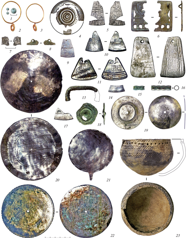 Могильник Нивагальское 34. Инвентарь из погребений 1 (1–8, 10, 11, 13–23, предположительно – 9) и 2 (12): 1 – бусина, 2, 3 – височные кольца, серьги, 4 – сломанное зеркало, 5, 9–12 – подвески из разрезанных зеркал, 6 – ажурная плакетка-накладка с изображением человека, 7, 8 – предметы неопределенного назначения, 13 – ручка котла, 14, 17 – обломки зеркал, 15, 16 – трубчатые гофрированные пронизки, 18 – бляха (подвеска-накладка), имитирующая зеркало, 19, 20, 22 – выпукло-вогнутые бляхи-зеркала с отверстием в центре, 21 – зеркало с насадом, 22 – глиняный горшок; 1 – стекло, 2, 3 – золото, 7 – серебро, 4–6, 8–22 – медь, бронза, 23 – глина (см.: Карачаров, 2011. Ил. 4–11, 15, 17–20, 22, 23, 27; 2017. Рис. 4, 1, 2; 9; 11, 1).