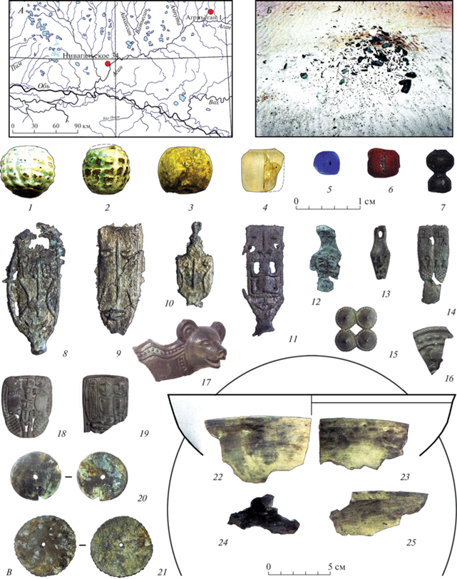 Могильник Агрнъеган I: А – местонахождение памятника; Б – разрушенные погребения; В – инвентарь: 1–7 – бусины, 8–10 – антропоморфные личины, 11 – личина с “оттиском” зооморфной бляхи, 12 – птицевидная отливка, 13 – подвеска с антропоморфными личинами, 14 – отливка в виде пары бобров, 15 – поясная бляха-накладка, 16 – фрагмент эполетообразной застежки с изображением головы медведя между лапами, 17 – обломок бляхи с изображением головы медведя, 18 – бляха с изображением антропоморфных персонажей, фланкированных фигурами бобров, 19 – бляха с изображением “семейной сцены”, 20, 21 – выпукло-вогнутые бляхи-зеркала с отверстием в центре, 22–25 – фрагменты чаши; 1–7 – стекло, паста; 8–25 – цветной металл (см.: Перевалова, Карачаров, 2006. С. 62–71; К-арачаров 2017. Рис. 1).