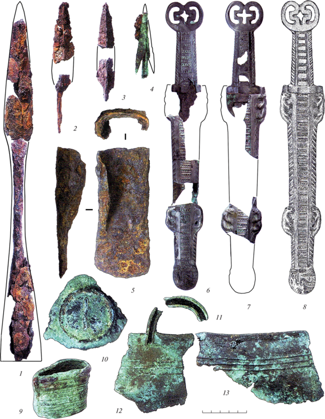 Могильник Агрнъеган I. Инвентарь из погребений: 1 – наконечник копья, 2–4 – наконечники стрел, 5 – топор-кельт, 6–8 – биметаллические кинжалы в бронзовых ножнах (8 – реконструкция К.Г. Карачарова и В.Н. Широкова), 9 – втулка-обойма, 10–13 – фрагменты котла; 1–5 – железо, 6–8 – железо, бронза; 9–13 – медь, бронза (см.: Перевалова, Карачаров, 2006. С. 67–69, 71).