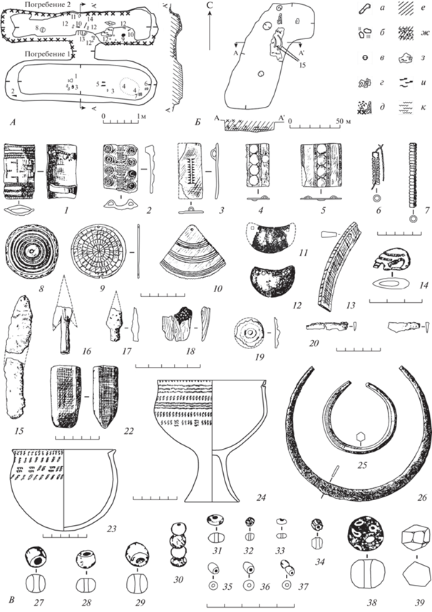 Могильник Шеркалинский: А, Б – планы и разрезы погребений 1–2 и 3 (север – магнитный): 1 – глиняный сосуд на поддоне, 2 – изделие из железа, 3 – полая бронзовая зооморфная подвеска-пронизка, 4, 12, 13 – бусы из стекла и пасты, 5, 10 – бронзовые гофрированные пронизки, 6, 7 – бронзовые бляхи-накладки с жемчужным орнаментом, 8 – глиняный горшок, 9, 11 – дисковидные бляхи с концентрическим декором, 14 – обломки железного ножа?, 15 – части бронзовой гривны; условные обозначения: а – погребения, б – ямы, в – ямкa, г – уложенные камни, д – угли, обугленные плахи, е – выщелоченный песок, ж – углистый песок (темно-серая супесь), з – береста, и – береста в разрезе, к – зола; В – инвентарь из погребально-жертвенного комплекса (1– 3, 8, 11, 13, 16, 25, 27), погребений 1, 2 (4–7, 9, 14, 19–21, 23, 24, 28–37), 3 (26) и культурного слоя могильника вне погребений (10, 12, 15, 17, 18, 22, 38, 39); 1 –14, 16, 19, 25, 26, 39 – медь, бронза; 15, 17, 20, 21 – железо; 18 – дерево; 22 – камень; 23, 24 – глина; 27–38 – стекло, паста (см.: Чиндина, 1984. С. 50–56. Табл. 5 . Рис. 21–24 ).