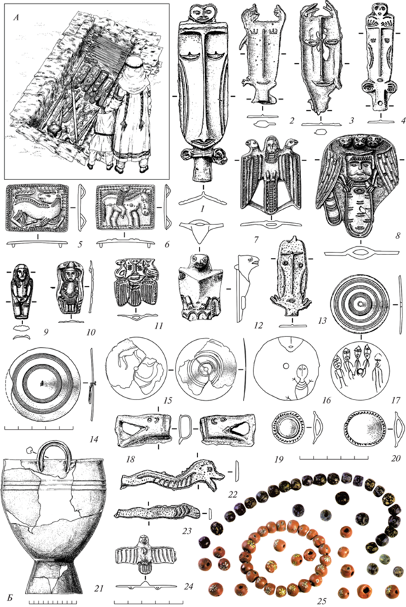 Холмогорский погребальный комплекс (“клад”): А – погребение кукол-иттарма (реконструкция А.П. Зыкова); Б – образцы некоторых изделий: 1–4, 7–13, 22–24 – “личины”, антропоморфные и зооморфные изображения, 5, 6 – бляхи с рельефными фигурами оленей и всадников, 14–17 – круглые бляхи-зеркала, в том числе с граффити, 18 – полое зооморфное навершие, 19, 20 – бляшки плоскоконические, 21– котел, 25 – бусы; 1–14 – бронза, 25 – стеклянная паста (см.: Зыков, Федорова, 2001. С. 96–114. Рис. 12, 14, 19 ).