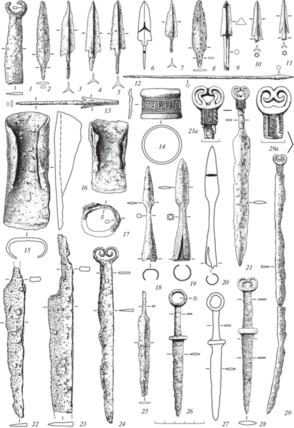 Холмогорский погребальный комплекс (“клад”). Некоторые образцы оружия: 1 – рукоятка рубильного ножа, 2–11 – наконечники стрел, 12, 13 – наконечники копий, 14 – наконечник ножен палаша, 15, 16 – топоры-тесла (топоры-кельты), 17 – обойма ножен палаша, 21, 25–28 – кинжалы, 22, 23 – ножи, 24 – рубильный нож, 29 – палаш; 1–8, 12, 13, 15–20, 22–27 – железо, сталь, 9 – кость, 10, 11, 14 – бронза, 21, 28, 29 – железо, сталь, бронза (см.: Зыков, Федорова, 2001. С. 115–125, 142–143, 152–155).