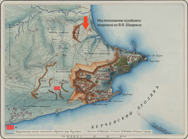 План-схема Керченской крепости 1880 г. (Шкорпил, 1900) с указанием местоположения иудейского некрополя, обнаруженного В.В. Шкорпилом в 1899 г., и участка иудейского некрополя, обнаруженного в 2020 г. (а).