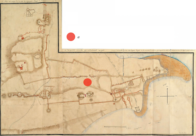 “План развалин города Нимфеи (Анонимный Перипл) и большие стены, ведущие в порт…” Не позднее 1835 г. (Дюбрюкс, 2010. Т. 2. С. 204, 205. Рис. 476): а – примерное местоположение участка иудейского некрополя, обнаруженного в 2020 г.