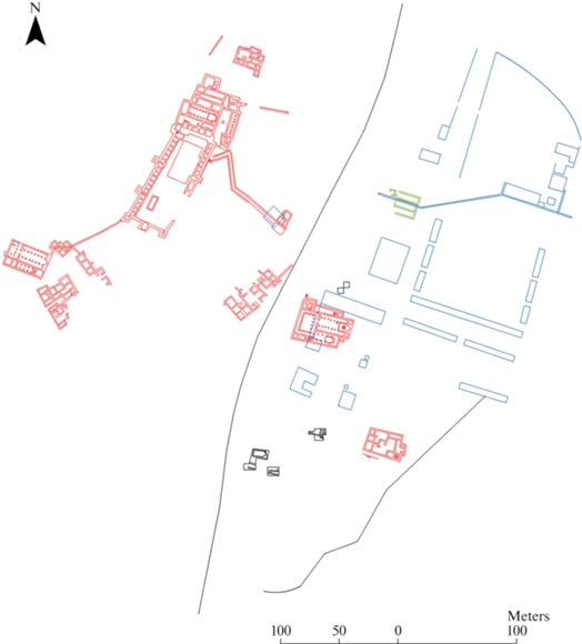 Общий план памятника. Раскопки прошлых лет показаны красным цветом, турецкие постройки Уджи аль-Хафир – синим, утраченная церковь – зеленым, участки полевого сезона 2022 г. – черным.