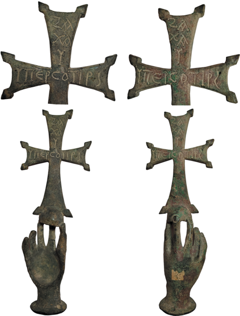 Широкое распространение вотивных предметов в форме бронзовых рук среди почитателей восточных культов объясняет популярность бронзовых рук, держащих сферу с крестом, именно в сиро-палестинском регионе, откуда происходит подавляющее большинство известных в настоящее время экземпляров. Естественно, что именно там христиане, которые заимствовали из языческих культов многие образы, сюжеты и символы, переосмысливая их и наполняя новым смыслом, стали использовать изображения правой руки с крестом, как с открытой ладонью, так и в жесте благословения как знак божественного покровительства и защиты (Metzger, 1955; Ross, 1964. P. 103; Залесская, 1967. C. 88). Заимствование языческой символики было характерно для переходного периода, когда христианство еще не стало доминирующей религией: недавно обращенные часто упорно держались за старые языческие символы и образы (Barasch, 2000. Р. 3, 4). Однако это заимствование не было механическим. Используя старые образы и символы, христиане транслировали идею превосходства новой религии. В частности, используя хорошо известное в различных языческих культах изображение руки и увенчивая ее крестом, они провозглашали победу христианства, что было особенно важно в эпоху ожесточенной религиозной борьбы (Barasch, 2000. Р. 22–23).