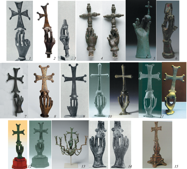 Вотивные бронзовые руки: 1 – из частной коллекции Mr. and Mrs. Werner Abegg (по: Ross, 1964. Fig. 1 left); 2 – из Королевского музея в Мариемоне (Бельгия) (по: Ross, 1964. Fig. 1 centre (интернет ресурс: http://www.numeriques.cfwb.be/index); 3 – из Королевского музея в Мариемоне (Бельгия) (по: Ross 1964, fig. 1 centre); 4 – из Музея искусства и истории в Женеве (интернет ресурс: https://collections.geneve.ch/mah/oeuvre/main-votive/ad-7879); 5 – из частной коллекции (по: Rom und Byzanz 1998, S. 78, N 68); 6 – из частной коллекции (по: Rom und Byzanz, 1998. S. 78, N 69); 7 – из Второго кипрского клада, хранится в Национальной библиотеке Франции в Париже (интернет ресурс: https://medaillesetantiques.bnf.fr/ws/catalogue/app/collection/record/ark:/12148/c33gb1573t); 8 – из Государственного Эрмитажа (по: Залесская, 2006. C. 134); 9 – из Археологического музея Стамбула (по: Ross, 1964. Fig. 2 left); 10 – из Музея искусства в Женеве (по: Martiniani-Reber, 2005. Fig. 2 и Lini, 2015. Fig. 8); 11 – из Музея искусства в Женеве (по: Martiniani-Reber, 2005. Fig. 3 (интернет ресурс: https://uk.wikipedia.org/wiki/%D0%A4%D0%B0%D0%B9%D0%BB:Arte_bizantina, mani_votive_con_croce,_VI-inizio_VII_sec.JPG); 12 – из Музея Монастыря Киккос (Кипр) (по: Martiniani-Reber, 2005. Fig. 4); 13 – из Метрополитен музея (по: Frazer, 1979. P. 621–622); 14 – из частной коллекции Mr. и Mrs. Ernst Kofler, в Люцерне, Швейцария (по: Ross, 1964. Fig. 2 left); 15 – из частной коллекции в Мюнхене (по: Witt, 2004. № 184).