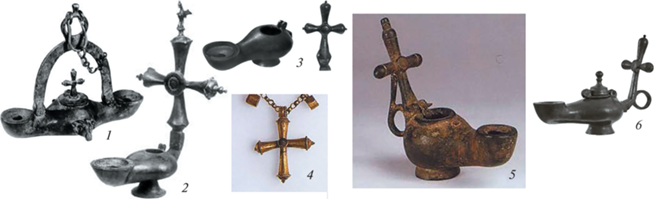 Различные формы крестов: 1–3, 5 – бронзовые светильники IV–VII вв. (по: Xanthopoulou, 2010. P. 9, 11, 133, 134, 161; Залесская, 2006. Кат. № 212); 4 – крест из ожерелья, входившего в состав мерсинского клада. Гос. Эрмитаж. (по: Залесская, 2006. Кат. № 191); 6 – светильник из раскопок города недалеко от Бяла (Болгария), конец VI – начало VII в. (по: Минчев, 2015. Обр. 1; табло I, 1–4).