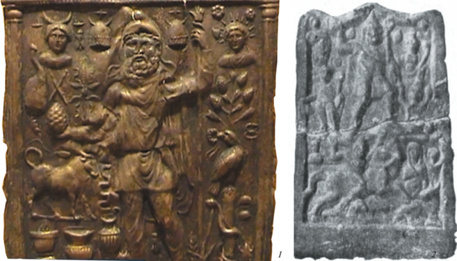 Однако их могли использовать и в культовых целях в качестве навершия жезла жрецов Сабазия, которые носили его во время культовых церемоний, как на хранящемся в Новой глиптотеке Карлсберга в Копенгагене рельефе из Албании (рис. 5, 1) или на вотивной пластине из Пловдива (рис. 5, 2), на которых сам Сабазий изображен с посохом, увенчанным рукой в жесте латинского благословения (Милчев, 1977. C. 74; Popova, 2009. P. 169). Аналогичным способом бронзовые руки использовали в культах Юпитера Долихена, Юпитера Гелиополита и других. Бронзовые руки, которые связывают с этими культами, часто имеют отверстия для гвоздей на запястье (Berndt, 2018. P. 154). Не исключено, что такие руки ставили в домах в качестве апотропея, т.е. они служили знаком присутствия божества и его защиты (P-opova, 2009. P. 169, 173, 174).