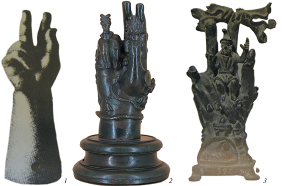 Руки Сабазия с различными типами оформления основания: 1, 3 – руки Сабазия из Геркуланума (по: Vermaseren, 1983. Pl. VIII, 12; IX, 13); 2 – рука Сабазия. Римский музей в Аванше (Швейцария).