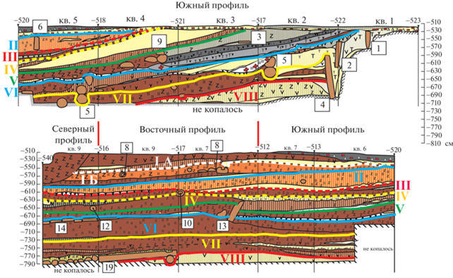 Стратиграфические профили раскопа 1. Обозначения: римские цифры – номера ярусов; арабские в квадратных рамках (здесь и на рис. 2–4) – номера сооружений; Z – щепа; V – уголь; II – навоз; = – глина; Т – древесный тлен; красный четырехлистник – кусочки печины; желтая заливка – песок. Цвет слоев в профиле условно соответствует настоящему.