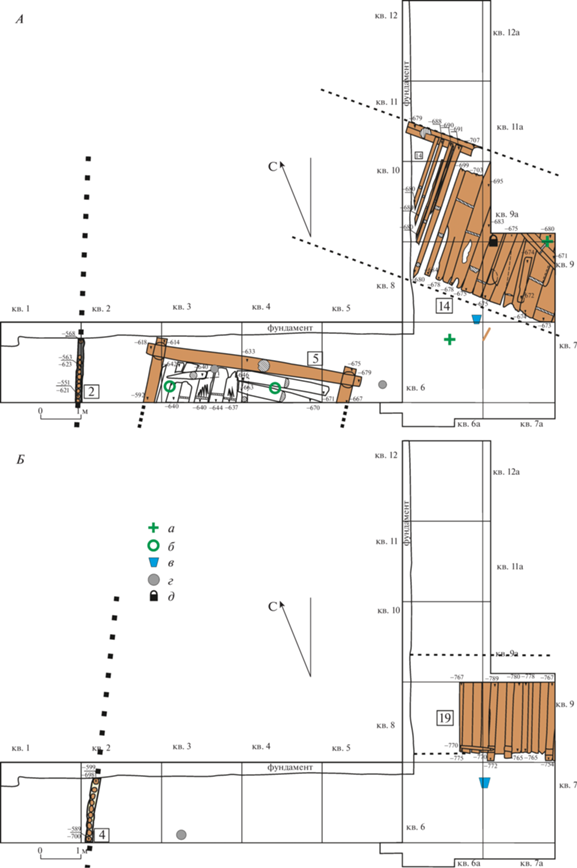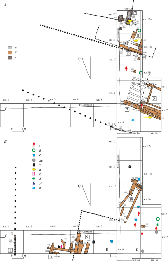 А – сооружения 1 и 2-го ярусов; Б – сооружения 5-го яруса. Условные обозначения: а – ярус?; б – ярус 1; в – ярус 2; г – предметы вооружения; д – перстни; е – импортная керамика; ж – пломбы; з – замки; и – монеты; к – стили; л – нательные кресты; м – бляхи; н – книжные застежки.