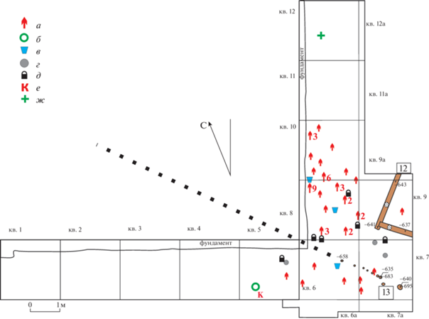 Сооружения 4-го яруса. Условные обозначения: а – предметы вооружения (цифрами дано количество более 1 шт.); б – перстни; в – импортная керамика; г – пломбы; д – замки; е – кошелек; ж – энколпион.