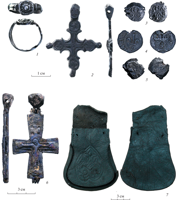 Вещевой материал из культурных отложений 4-го яруса. 1 – перстень; 2 – нательный крест; 3, 5 – русские пломбы; 4 – западноевропейская пломба; 6 – энколпион; 7 – кошелек. 1–6 – изделия из цветного металла; 7 – кожа.