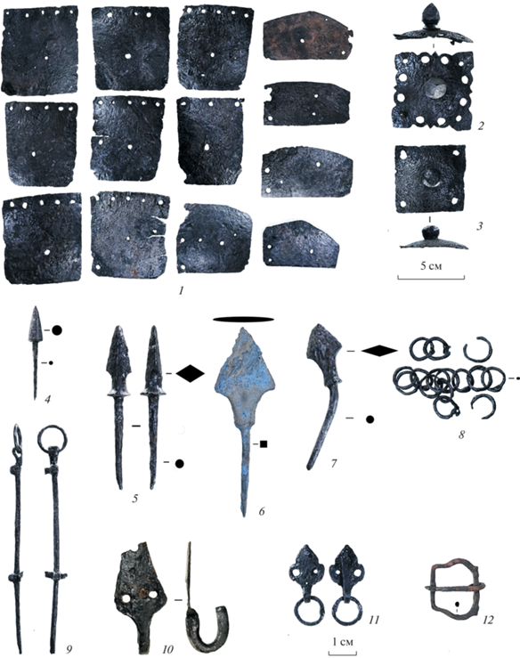 Железные предметы вооружения из культурных отложений 4-го яруса. 1 – панцирные пластины; 2, 3 – накладки на шлем; 4–7 – наконечники стрел; 8 – фрагмент кольчужного плетения; 9 – оковка ножен; 10–12 – поясная гарнитура.