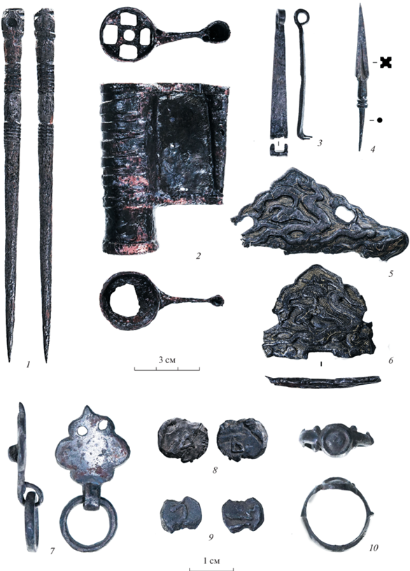 Вещевой материал из культурных отложений 5-го яруса. 1 – стиль; 2 – замок; 3 – ключ; 4 – наконечник стрелы; 5, 6 – бляхи с золотой плакировкой; 7 – поясная накладка; 8, 9 – русские пломбы; 10 – перстень. 1, 3, 4, 7 – железо; 2, 5, 6 – биметалл; 8–10 – цветной металл.