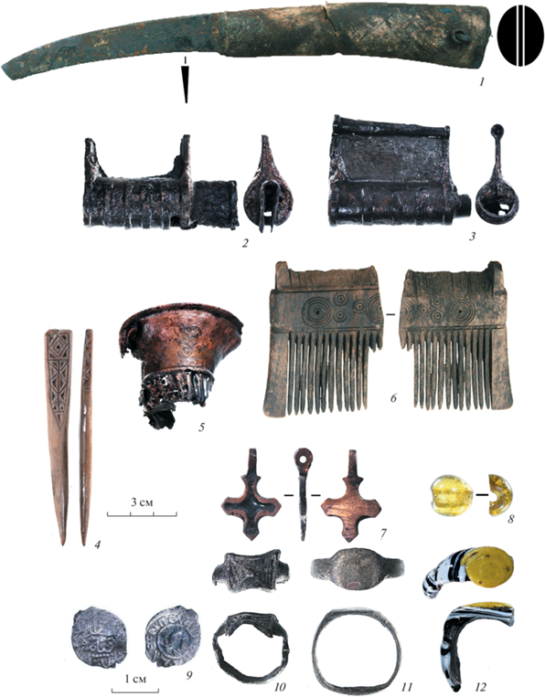 Вещевой материал из культурных отложений 1–3-го ярусов (2, 4, 5, 9–11), 6-го яруса (3, 7, 12), 7-го яруса (6), 8-го яруса (1, 8). 1 – нож (железо, дерево); 2, 3 – биметаллические замки; 4 – костяное писало; 5 – медная чашечка; 6 – деревянный гребень; 7 – крест (цветной металл, эмаль); 8 – стеклянная бусина; 9 – серебряная монета Василия Дмитриевича; 10, 11 – перстни (цветной металл); 12 – фрагмент стеклянного перстня.